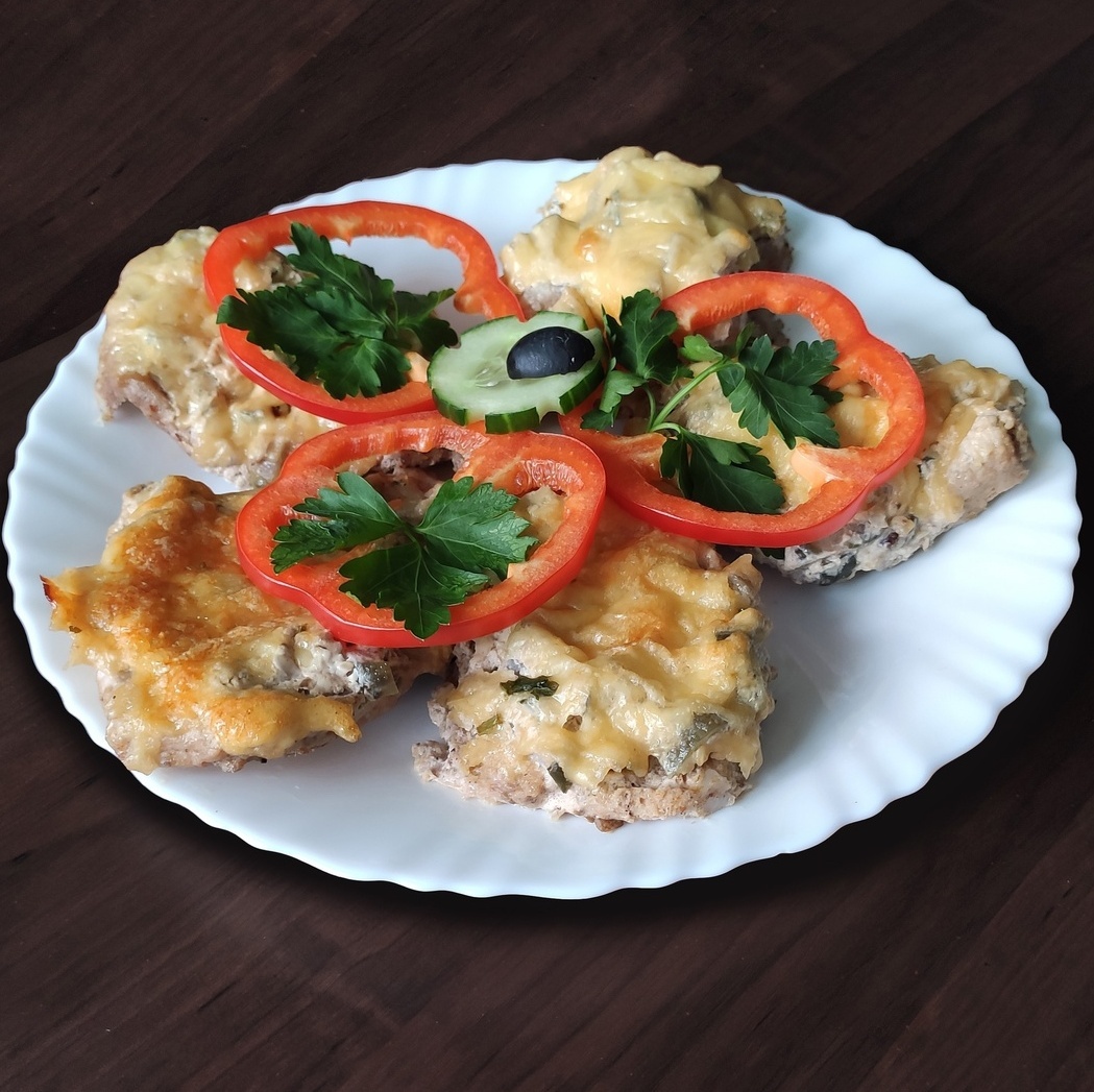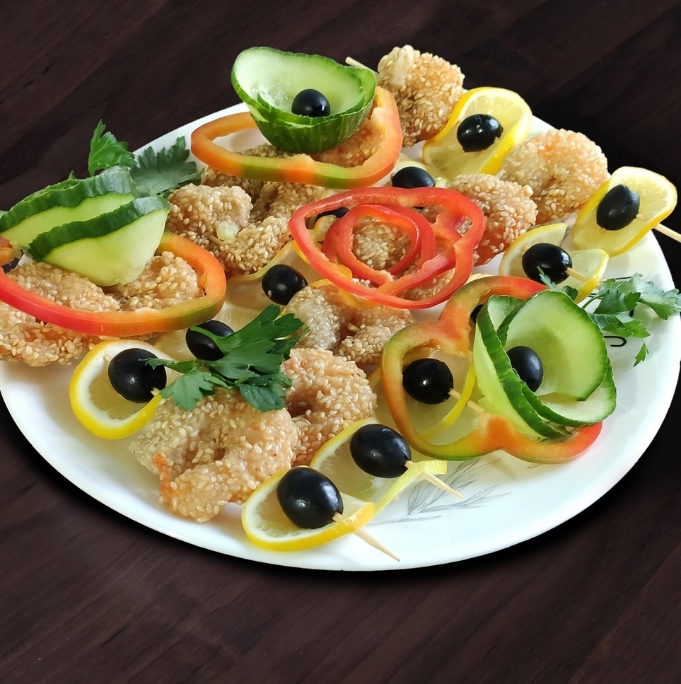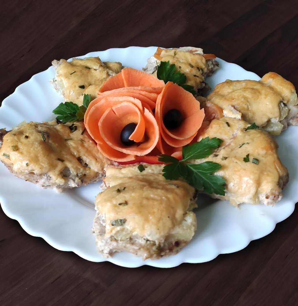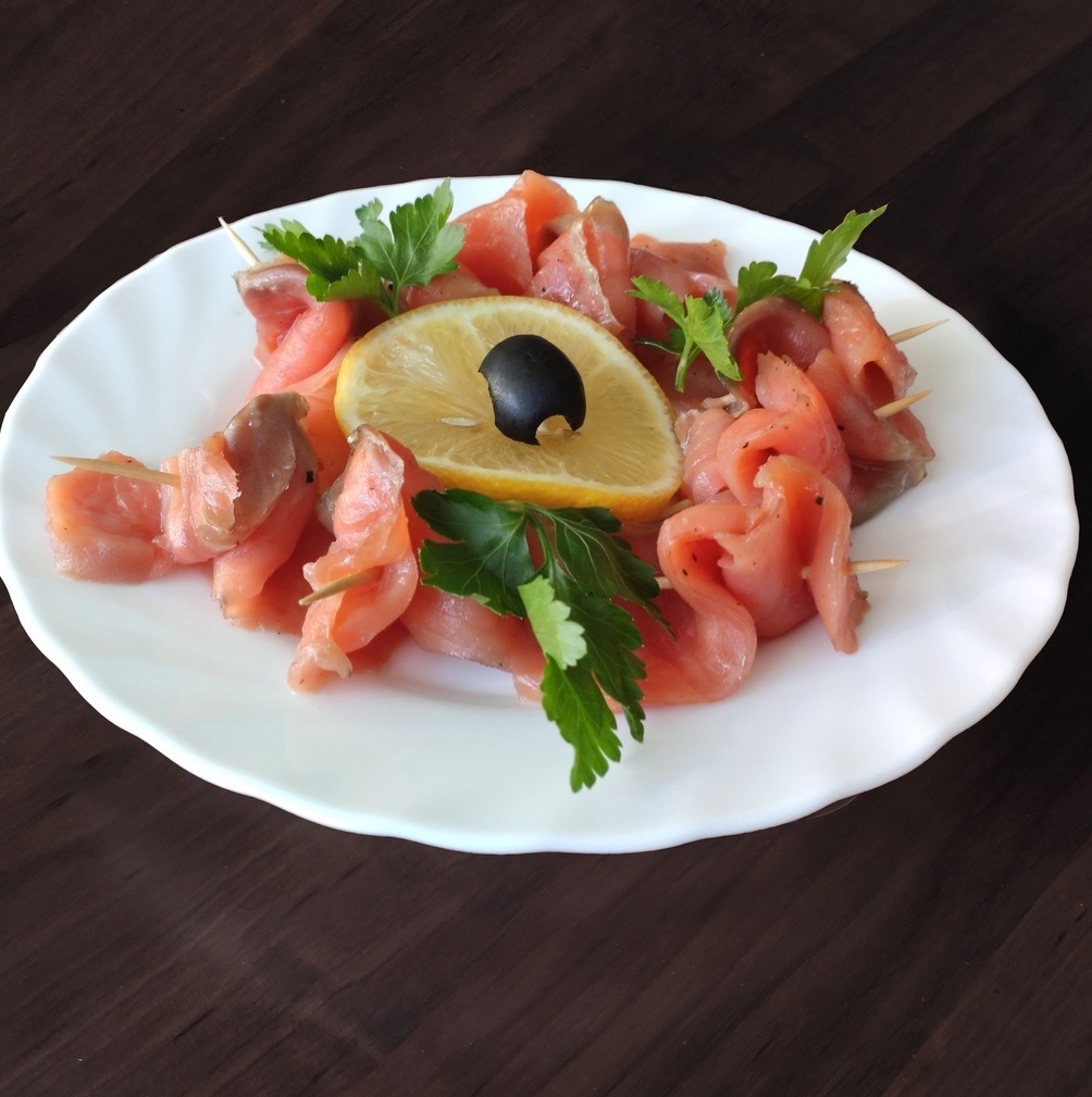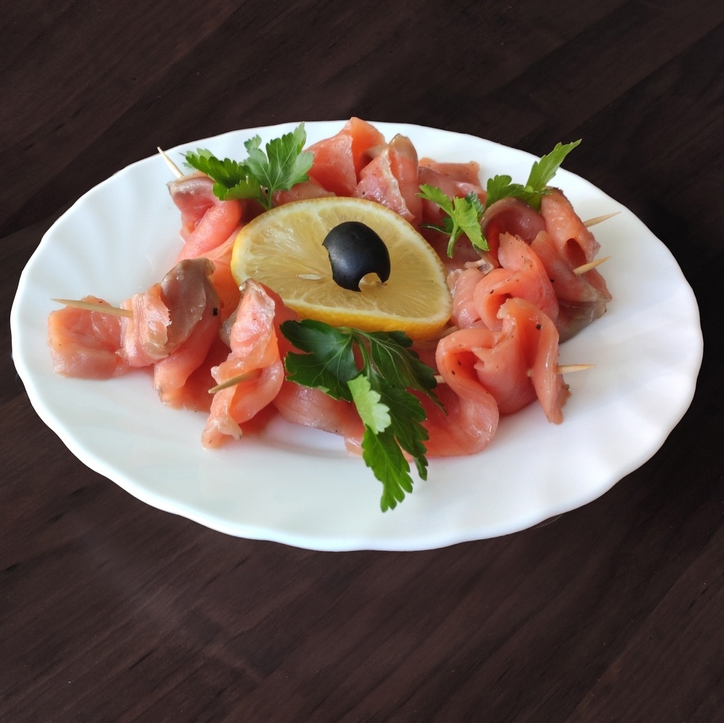 1. Нарезка мясная: рулет куриный с омлетом / буженина 2. Шашлык из форели